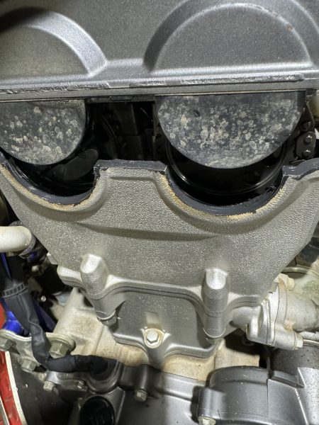 Place a small bead of silastic on the sealing surface around the half-moon sections where the gasket will seal. This will dry and form a tighter seal and prevent the gasket from weeping.