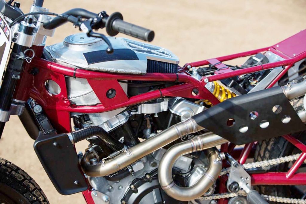 Polaris commissioned a purpose-built flat tracker powered by a 750cc, 53-degree V-Twin developed by a subsidiary company, Swissauto, in Switzerland. The engine has dual overhead cams, with four valves per cylinder. It also has liquid-cooling, fuel injection and a counter-balancer to reduce vibration.