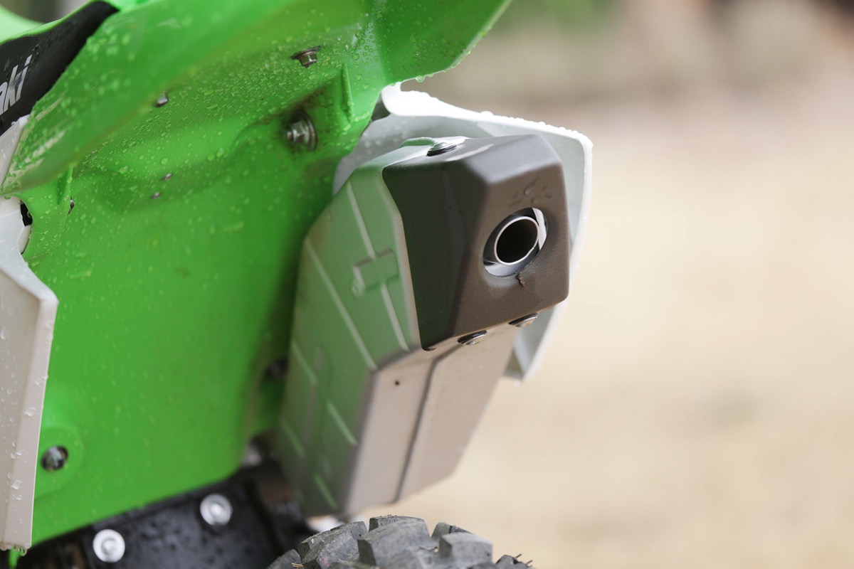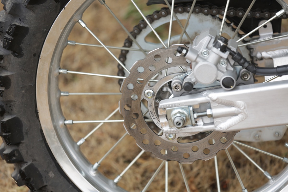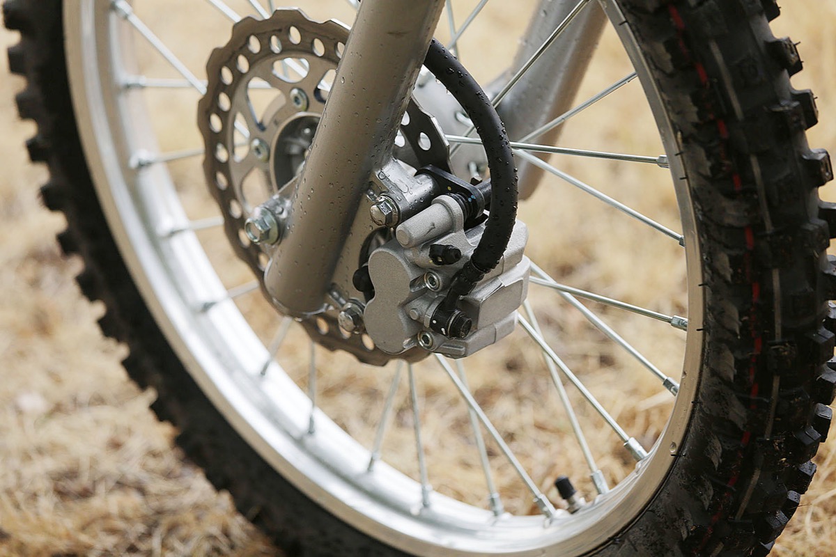 The bike has front and rear wave brakes, with a 220mm front disc and twin-piston caliper. The caliper runs the same 27mm pistons that the KX450/250 run. The rear wheel is slowed by a 186mm wave disc that is gripped by a single-piston caliper.