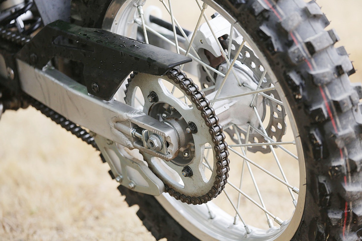 The aluminium swingarm contributes to the light weight of the bike while maintaining the necessary strength. The wheels have strong, diecast hubs for durability, and aluminium rims.