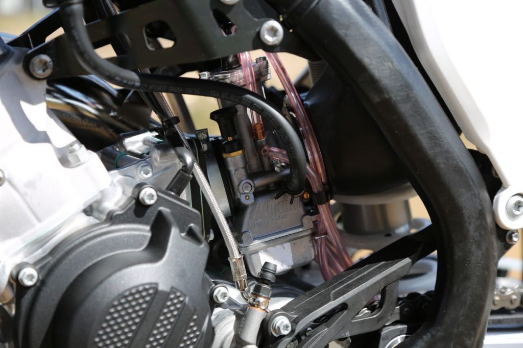 KTM has made the switch to Mikuni carburettors across the two-stroke range, replacing the Keihin. “The old KTM used a Keihin carby and it used to have problems with not revving out up top,” he said. “The Mikuni in the bike we rode today had the opposite problem. It still needed a little bit of work, but we sorted it by raising the needle clip, but it revs so much better up top. It’s jetted too rich from the factory but it was easy to fix.