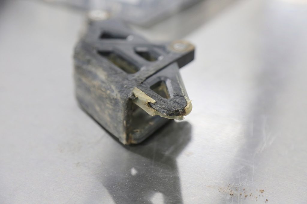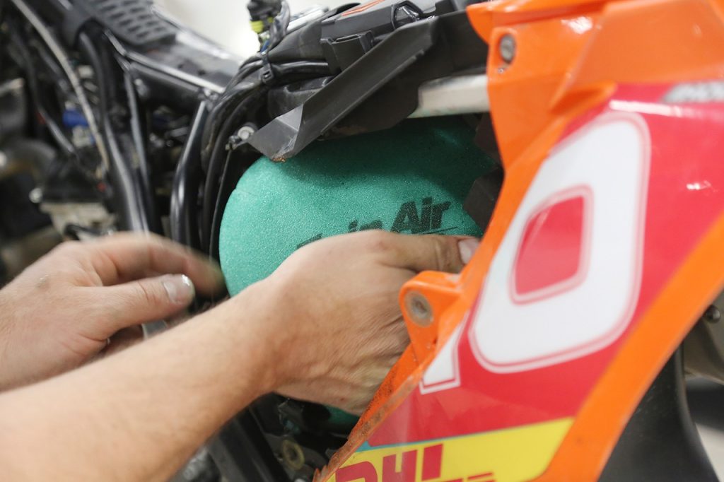 Mick replaced my flogged-out air filter, which he said was oiled perfectly, especially the grease layer around the edge to ensure it seals. He then replaced the plastic frame guards because the old ones looked a little worn and scratched. Miraculously, the cable ties were still in place and none had busted. We then moved onto the chain, sprockets and chainguide.