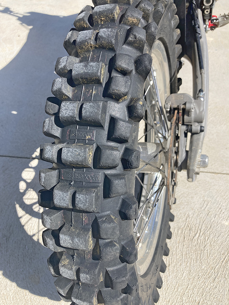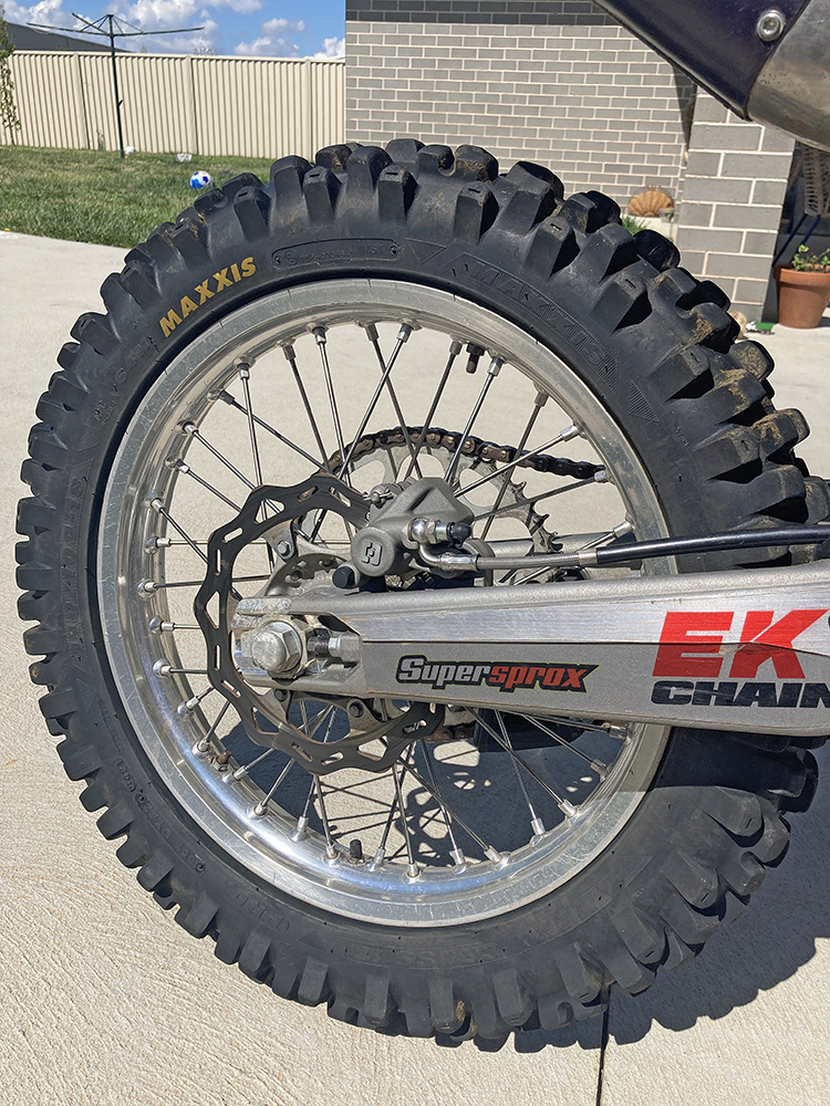 Up front is Maxxis’ newest tyre, cleverly called the New Enduro. It has a wider profile than some fronts and I got it in a 90/90 x 21. When I first looked at its aggressive knob pattern I thought the side knobs would fall off in the first day or two but after three solid days of riding, the side knobs are still in place and the grip levels are amazing.