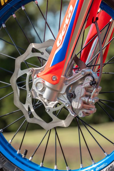 Two-strokes are often unstable at high speed and can feel flighty through choppy bumps, but to my surprise, the Beta 350 handles all of this like a modern four-stroke, very solid and planted. The diaphragm clutch has a lovely action and provides a precise, accurate feel at the lever. The brakes, front and rear, are strong. In an age where many brands are moving towards a spongier feeling front master cylinder, I personally prefer the solid lever feel that Beta delivers.