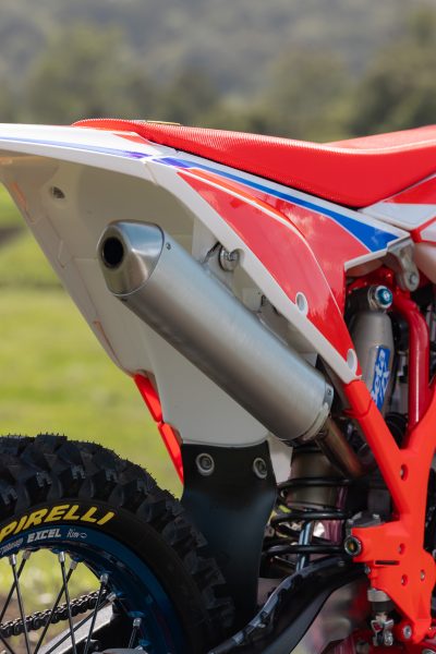 To achieve this, the 350 runs a longer stroke and a larger bore. It also features Beta’s twin–spark plug cylinder head, designed to enhance combustion, this setup is exclusive to the 350. Importantly, the 350 is not just a 250 with a bigger piston. It’s a purpose-built 350cc engine with its own exhaust system, power valve, mapping, carb settings, gear ratios and final-drive ratios.