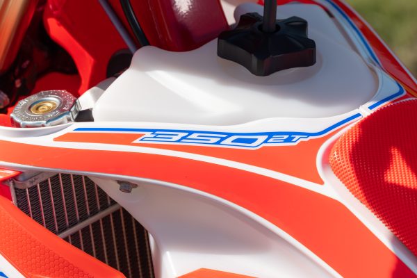 On the track, the 350 is a pleasure to ride. The flat seat–tank junction gives you plenty of room to move, and the gripper seat adds loads of traction to your rear end. The bar-to-seat and seat-to-peg ratios are very comfortable, providing ample space without making the bike feel big or bulky. The entire frame and chassis layout is extremely well balanced and a real credit to Beta’s engineering. Even the ergonomics and plastics are comfortable, with no sharp lips or edges waiting to catch your boots or pants.
