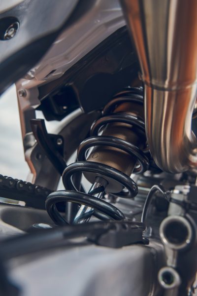 The TF 450-X uses Triumph’s aluminium spine frame — a twin-cradle design intended to balance rigidity and flex. The hydroformed swingarm and race-developed linkage system reduce weight while improving rear grip and suspension response.