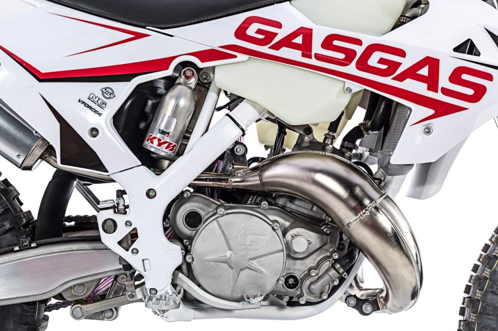 In the suspensions section, Gas Gas maintains all its confidence in the renowned quality and reliability of the firm Kayaba, incorporating a new front fork from the Japanese firm, this time 46 millimeters in diameter with open cartridge andcompression and rebound adjustment at the front; and the same adjustable rear shock absorber as used by the EC models, varying only in length, with preload and rebound adjustment. As for the braking system, the new Gas Gas model uses new NG brand discs – 260 mm front and 240 mm rear – and also new brake calipers and pistons, a system developed exclusively by Braktec for this version.