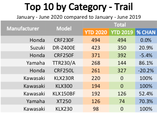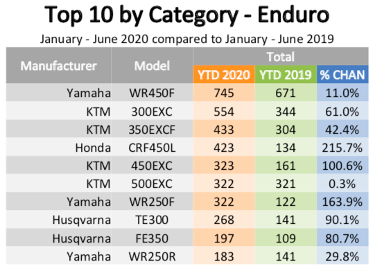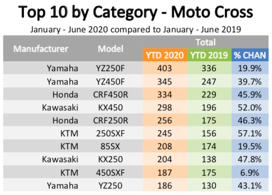 Yamaha claimed the largest market share in off-road motorcycle sales, selling a total of 6170, up 49,2% compared to the same period last year. Honda was second, having sold 5497 motorcycles, up 31.4%. KTM was third with 3338, an increase of 36.6%.