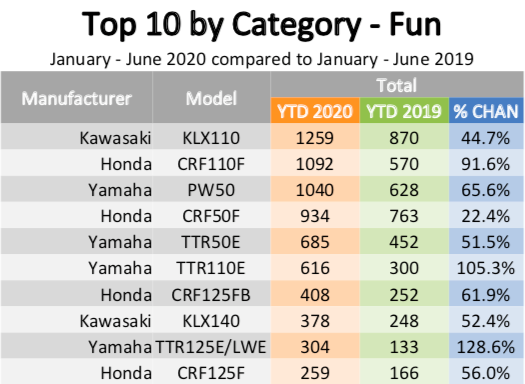 In the Fun Bike category, it was a feeding frenzy on showroom floors. Kawasaki’s KLX110 up 44.7%, Honda’s CRF110F up 91.6% and even the PW50 improved on its impressive track record, posting a 65.6% increase.
