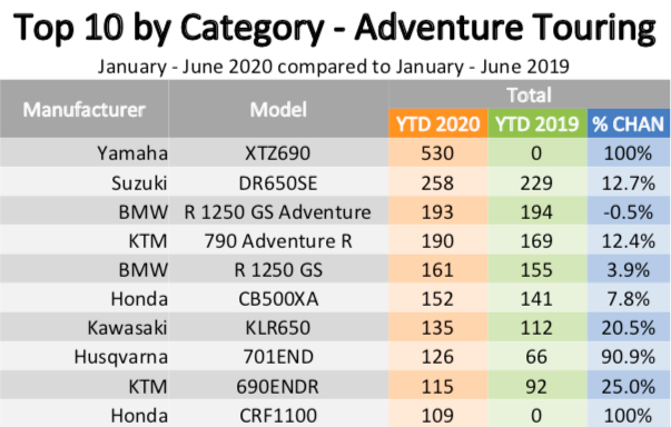 Yamaha’s new XTZ690 Ténéré outsold its adventure rivals by more than double. 530 XTZ690s were sold in the first half of the year, more than double second in category, the Suzuki DR650SE, with 258 sold.