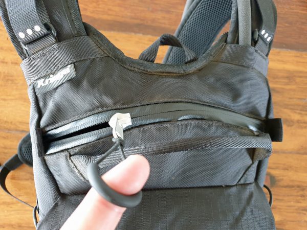 A weatherproof zip seals the main storage compartment that houses the 3.75-litre Hydrapak bladder. A strong Velcro tab holds the plastic bladder seal in place the so the bladder is always draining to the bottom where the hose connects. The bladder has measurement increments printed on it so you know exactly how much liquid you are carrying. I love this because it helps me calculate my fluid intake.