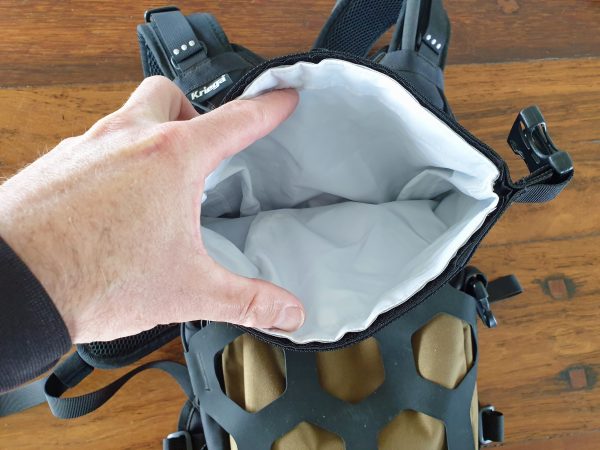 The four-litre storage pocket is totally water-proof making ideal for your phone and wallet or any other sensitive goodies you might need to take on a ride. I can have the bladder full, a number of items in the waterproof compartment like spare gloves, phone, wallet, spray jacket and some snacks, and still be able to carry an enduro jacket rolled-up in the external pocket that uses a Hypalon net with elastic draw-string to hold it in tight.
