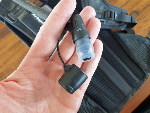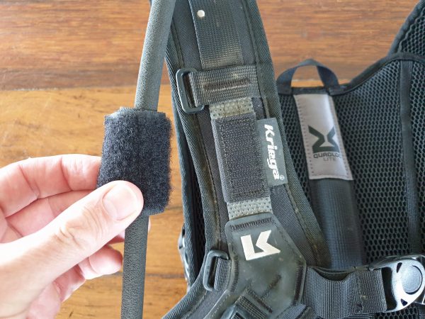 The bite-valve on the feeder hose comes with a hard-plastic cap which keeps mud and such off the valve, which is another great feature. The other smart feature I love is the Velcro patch around the feeder tube that mates to the relocatable spikey Velcro tab that I run on the right-hand shoulder strap. This keeps the feeder tube exactly where I want it for easy use when I need a drink. You can located this anywhere on either shoulder strap but I prefer it on the right strap so it’s easy to grab with my left hand while my right hand stays on the throttle grip and front brake lever.