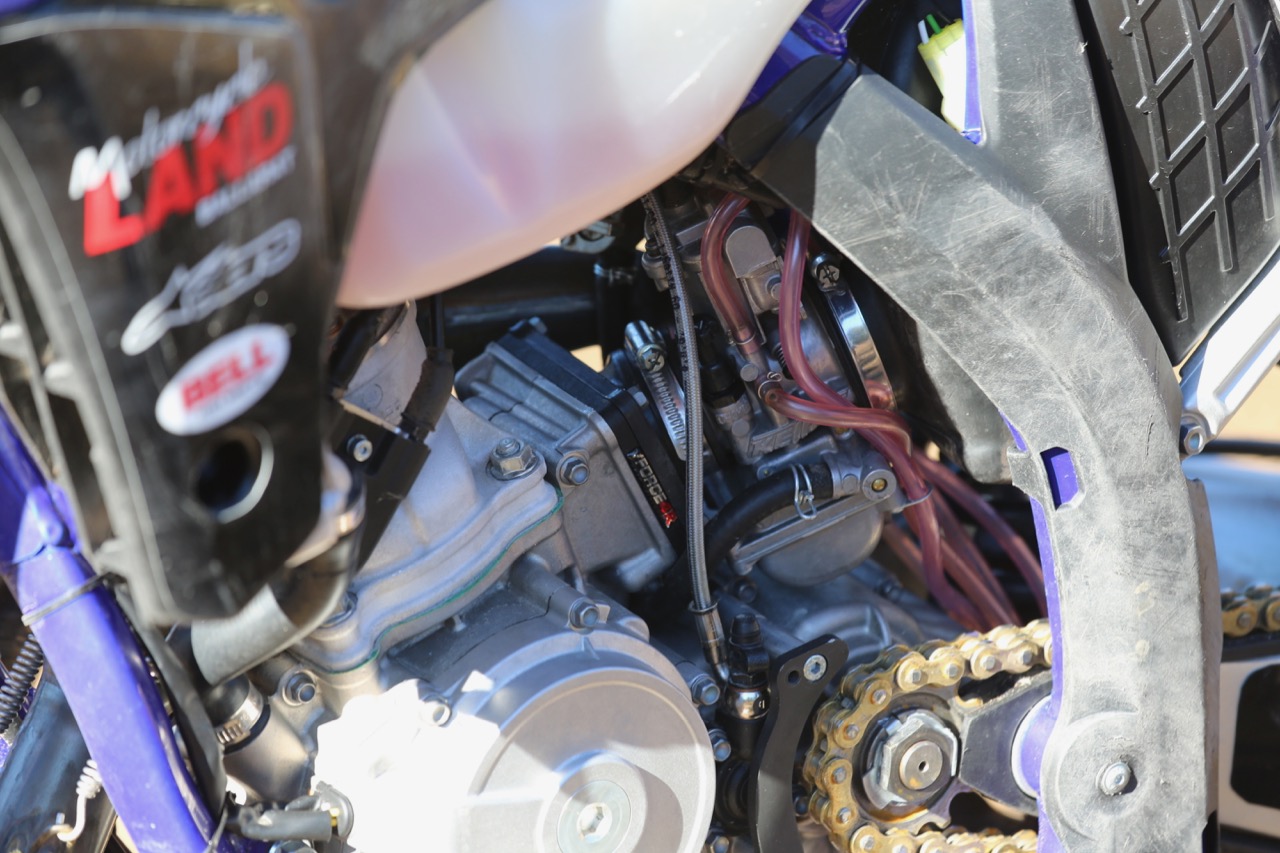 Pushing the bike around the pits I soon remembered how light a 125 is. Next, I went for the kickstarter before I remembered it doesn’t have one. Oops, I hit the button and this two-stroke sounded extra special and crisp with its Fresco exhaust combined with a Fresco Lite Series muffler.
