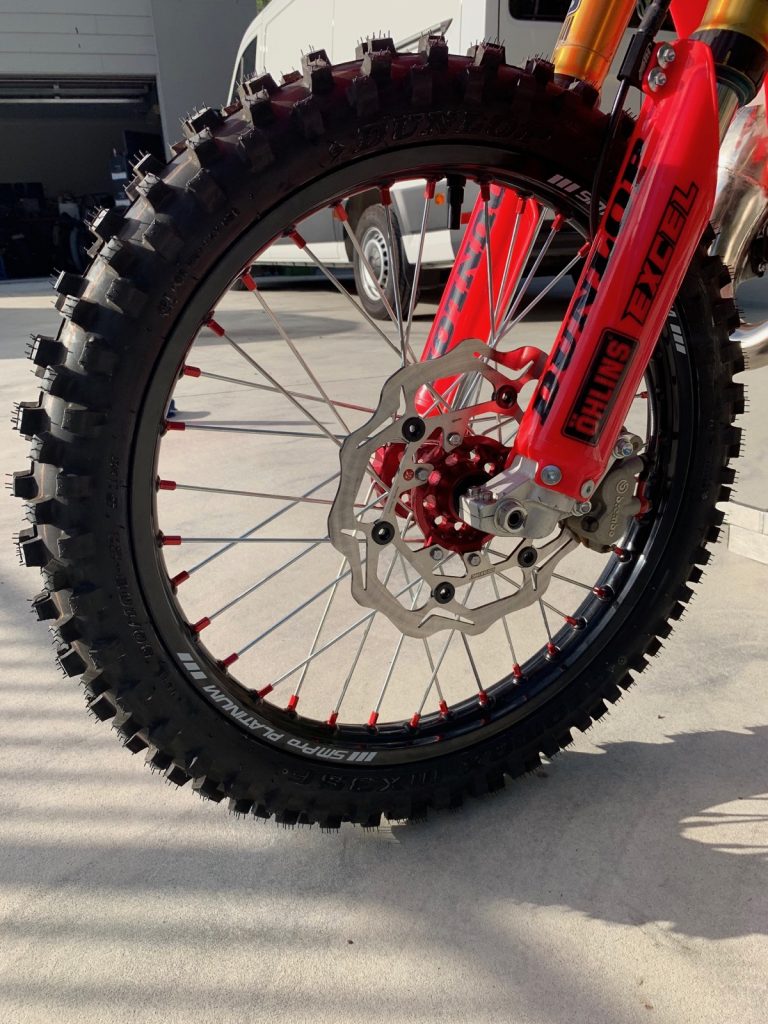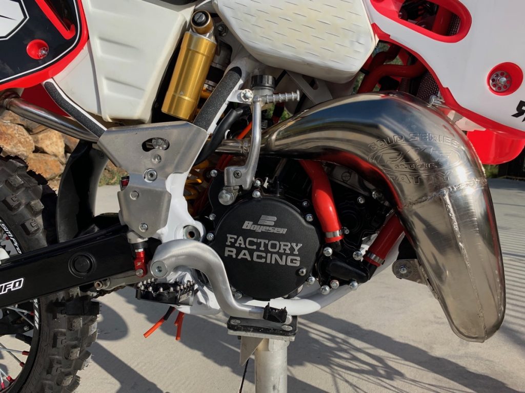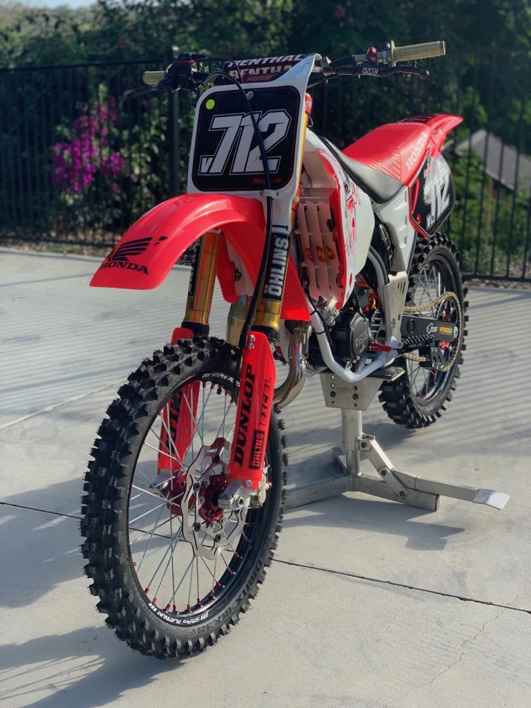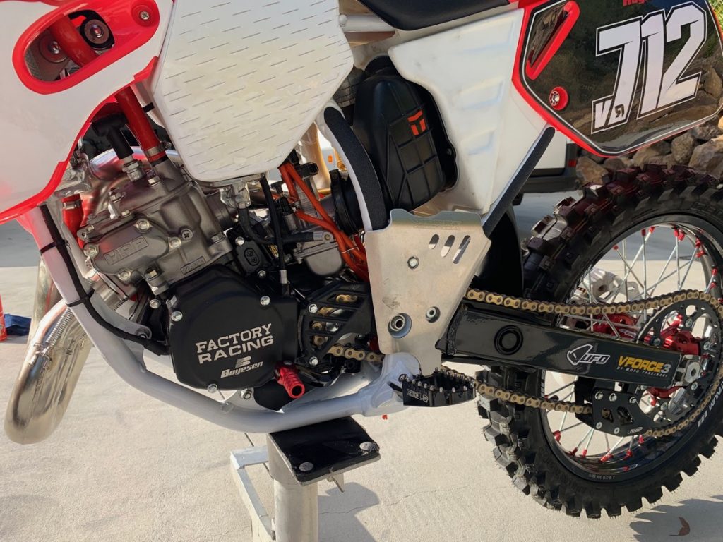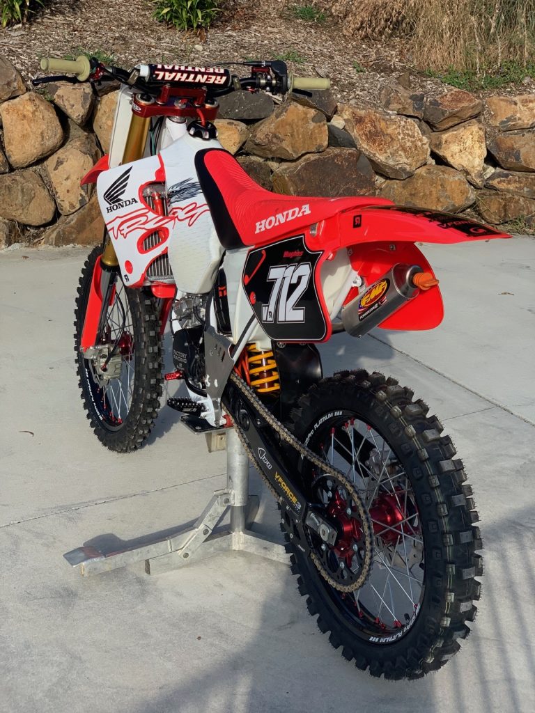 The footpeg mounts were completely flogged out, so I cut and welded some CRF250 mounts on and now I can use wider Torc1 footpegs. The front and rear suspension is Ohlins. The rear is a period-correct shock that I rebuilt but the fork is a factory TM model. I modified the Brembo front brake caliper bracket to provide the correct spacing for the anodised hub and axle. The SM Pro Platinum rims were designed to suit an ‘06 CR125. I run a 270mm front disc and a 240mm rear disc so it stops really well. Both discs are Braking wave rotors which my good friend Pat sourced. The triple-clamps were one of the hardest things to chase down. It is a CRF Factory Pro Circuit clamp. The bike has new UFO plastics and a new Clarke tank. The sticker kit was done by Ride Design. It also has a Renthal Twin Wall handlebar and a Works Connection clutch lever. I also added GPI oversize radiators to keep it cool.