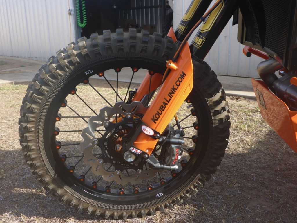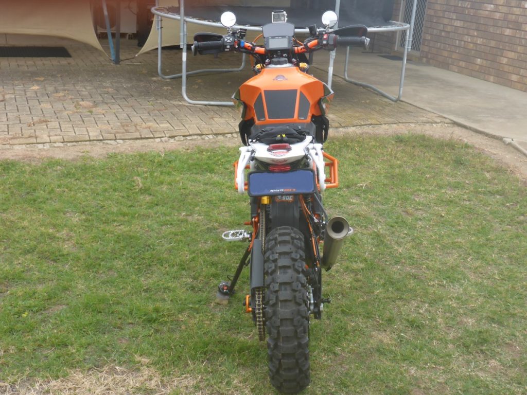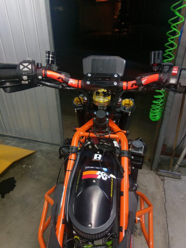 How long’s a piece of string? Where do I start? The project started as a brand new 2018 white Super Duke R. The tank and shrouds were sent straight to a paint shop to have them sprayed orange and black. I had the rest of the bike delivered and I stripped it the next day to the bare frame, electrics and engine, with only 5km on the clock. I replaced the suspension, put the Adventure swingarm on it, the Italian Kineo tubeless, CNC-machined wheels and there is heaps more. I just went to town with it. I don’t work anymore because I broke my back, so I just plod around building stuff and ride when I can. The build took me about three months.