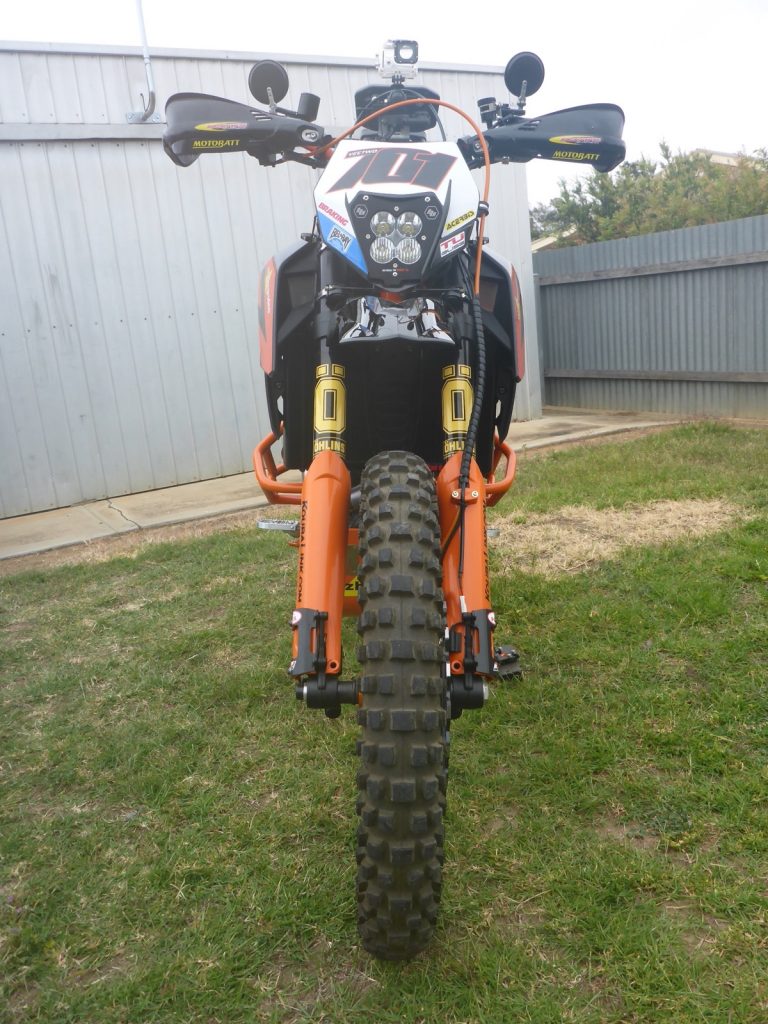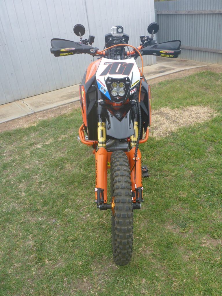 It runs pretty awesome. It’s going to chew through tyres pretty quickly. If you’ve been on a Super Duke, it’s like that on dirt. I bypassed all the ABS and that rubbish. I grew up racing 500cc motocross bikes. I didn’t need that shit then and I don’t need it now, really. I’ve got an Open Flash ECU from a guy in the UK and it has dyno’d at 180hp. A lot of people ask me if it feels heavy and it doesn’t really. It feels a lot like the 950 Super Enduro. People always think that it must be too big, but it’s no different to sitting on an XR600 with a bigger tank on it. I use it mainly for open dirt-road stuff. It’s not really built for the tight stuff and jumps.