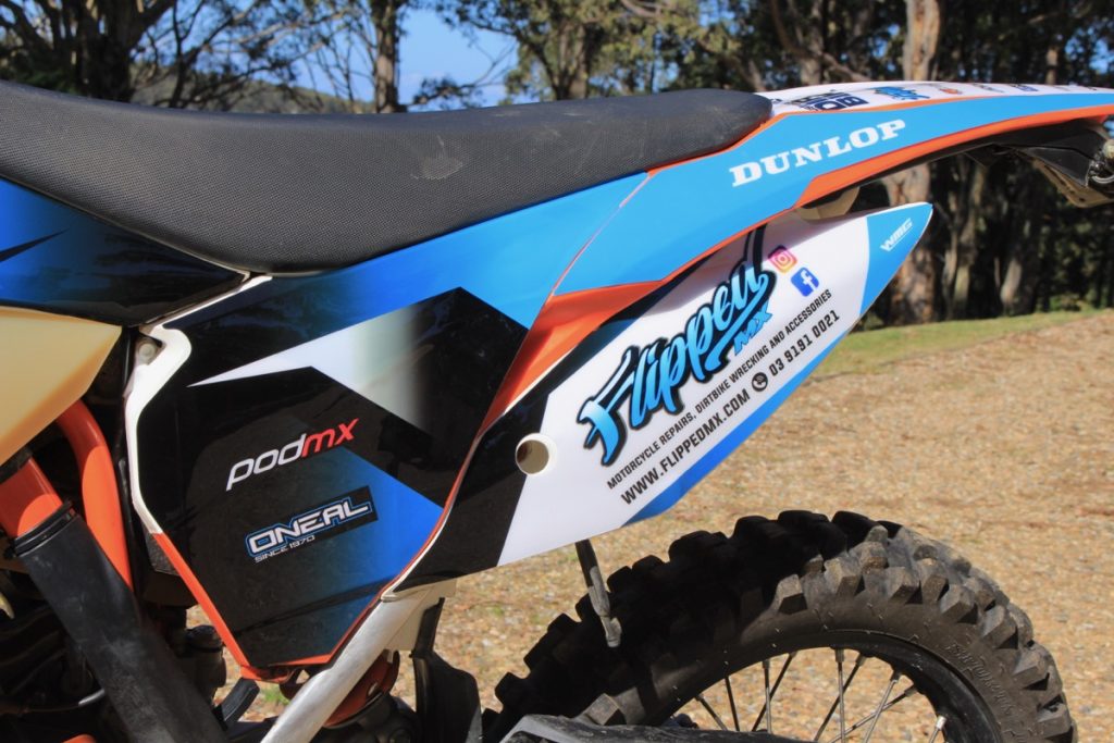 As a full-blown meedja celebrity type I need to look the part and also I was a bit jealous of the flash ADB graphics that the full-time staff sported on their bikes. A quick call to Flipped MX and the required stickers arrived in a very important-looking package that no doubt impressed the postman.