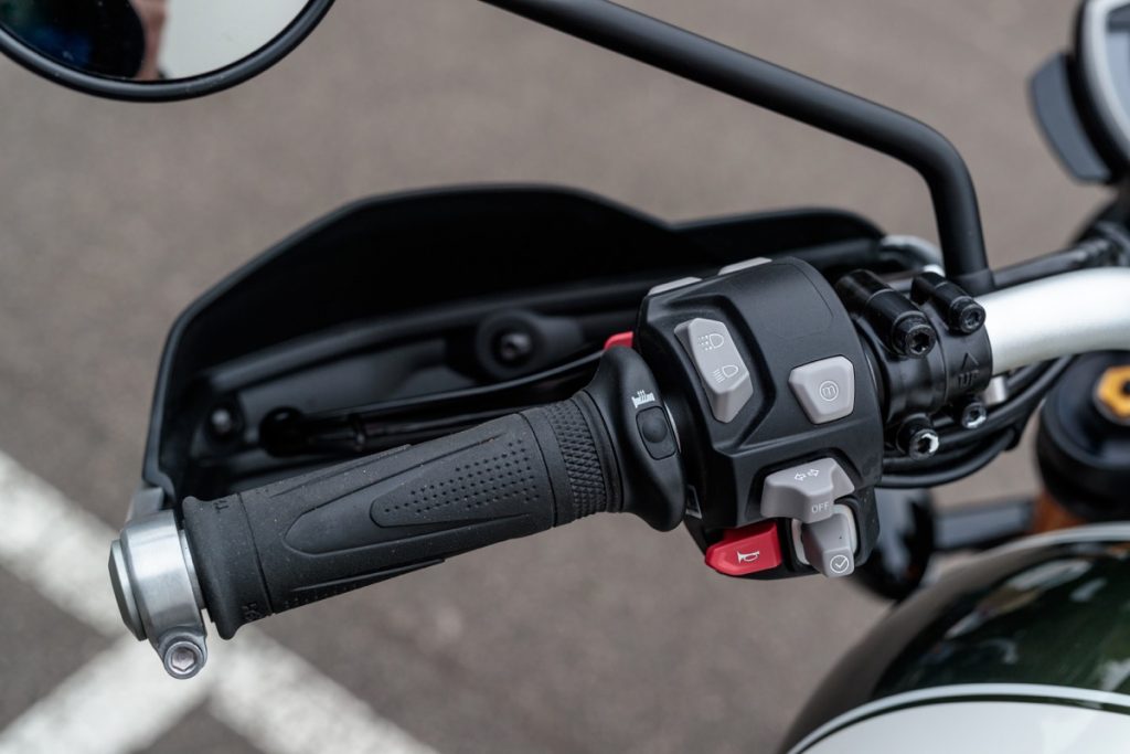 On closer inspection, when you look down you’ll notice an aluminium bashplate, crashbars and retro, shorty aluminium mudguards. On the handlebar you’ve got all your typical gadgets like a switchblock that controls the rider modes on the left (see sidebar) and the stop/start button on the right. Sitting on the Scrambler XE it feels like a dirtbike, albeit a big, heavy one.