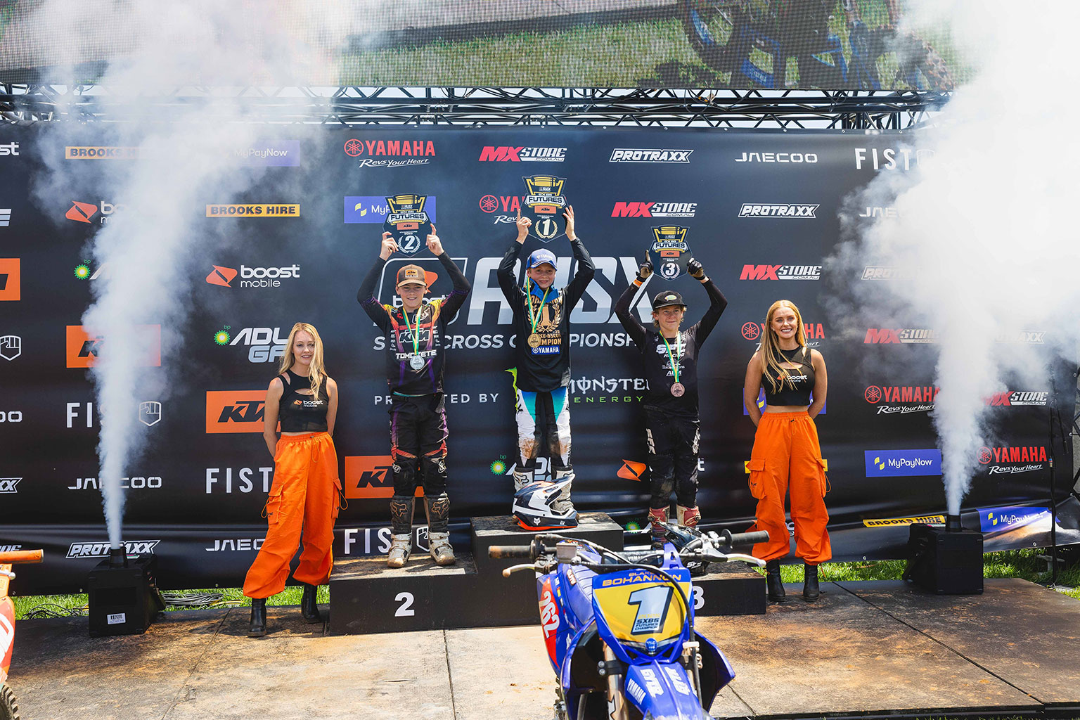 Main Event 2 added another layer of adversity as Bohanon, riding with a strapped-up thumb from the earlier spill, was taken down again in Turn 2. Twice down, twice back on—the young Queenslander dug deep and pieced together a recovery ride that yielded exactly what he needed. He clinched the 2025 85cc Futures title ahead of Birkett, with Luis Cannon third overall, a gutsy, hard-earned crown that said as much about character as it did about speed.