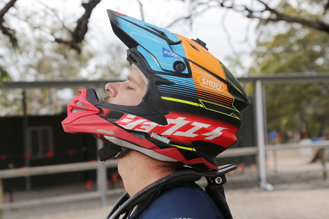 It’s the hero lid in Shoei’s wide assortment of quality headwear. Loaded with features like a six-layer Multi-Ply Matrix AIM+ Shell (what a mouthful, it’s just loads of fibreglass), Motion Energy Distribution System (M.E.D.S.), Emergency Quick Release System (E.Q.R.S), an EPS liner and, just for me (I crash a lot) an adjustable peak with screws that shear off if you have a crash.