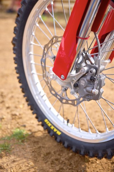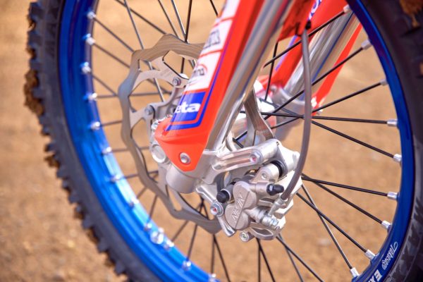 Beta hasn’t skimped on braking or suspension components, either. The RX 450 is fitted with Nissin brakes – 260mm wave disc in the front with a double-piston floating caliper and a 240mm wave disc in the rear with a single-piston caliper. This setup provides strong, reliable stopping power for handling the track’s toughest sections. The KYB suspension system, featuring a 48mm closed-cartridge front fork with 305mm of travel and a 50mm body rear shock with 300mm of travel, is set up with comfort in mind, offering a plush and forgiving feel while still maintaining good hold-up in the stroke. This makes it an excellent choice for entry-level 450 riders who need a bike that’s easy to handle without sacrificing control.
