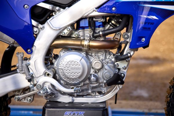 Underneath all this comfort lies an engine with serious power. The 450cc liquid-cooled, DOHC, 4-valve engine spools up like a turbo, with a rapid RPM climb that makes the YZ come alive on straights. The crank is light, giving the engine a quick-revving feel and letting it drive hard out of corners. The straight-line acceleration is exhilarating. With a compression ratio of 13.0:1 and Yamaha’s fuel injection system, the bike offers impressive power, but it demands refined throttle and clutch control, especially for less experienced riders. The cable clutch provides a nice, precise feel, though it does require occasional adjustments to maintain clutch free-play, especially under heat. This level of refinement may be numbered, as many bikes now move to hydraulic clutches, but for now, the YZ clutch feels solid and responsive.