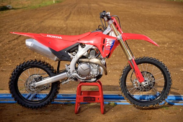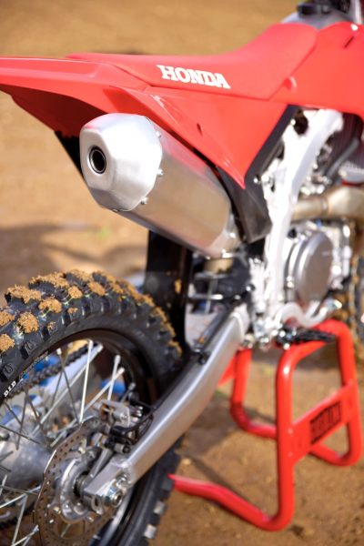 Honda’s five-speed transmission and chain drive deliver the power smoothly, but if I could get my hands on a CRF450R with revalved suspension and a more free-flowing exhaust, I think it would be hard to find any real faults in the bike. With a wheelbase of 1482mm and ground clearance of 333mm, Honda’s geometry combines agility with stability, providing riders with a balanced and comfortable experience. The CRF450R’s 6.3-litre fuel capacity is ample for extended sessions, and with an overall length of 2183mm, width of 827mm and seat height of 961mm, the bike feels spacious without being bulky.