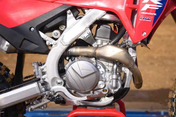 In the engine department, Honda made incremental improvements for 2025, yet it still leaves a little to be desired. The 449cc liquid-cooled, single-cylinder, 4-stroke engine with a 13.5:1 compression ratio feels slightly held back by the restrictive stock exhaust, which chokes airflow and prevents the engine from reaching its full potential. The engine’s sound hints at a willingness to rev, but the gases feel trapped, causing a slower power curve compared to the KTM and YZ450F. Although that restraint makes the Honda easier to handle, it lacks the punchier excitement found in those rival models. The map switch does offer a bit more aggression in the power delivery, but to fully open this engine up, a new exhaust would be essential.