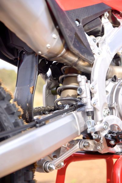 Ergonomically, the KTM is typically a bike that takes some getting used to, especially with its Neken handlebar, which has a reputation for being stiff and transmitting vibration. However, this year at our 450cc motocross shootout, I found myself adjusting to it quickly and didn’t notice the usual feedback through the ’bar. The KTM’s central double-cradle-type 25CrMo4 steel frame, paired with a 1493mm wheelbase, provides a stable and well-balanced feel, while the 958mm seat height allows for good control and manoeuvrability.