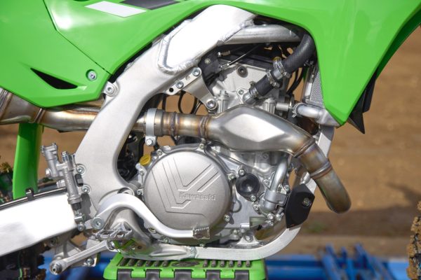 However, the new KX450F faces challenges with both its engine and suspension. The 449cc single-cylinder, DOHC, liquid-cooled engine, while well-equipped with DFI and a 44mm Keihin throttle body, doesn’t deliver the punch that riders expect in the 450 class. With a compression ratio of 12.5:1, it feels underpowered, closer to a 350 in its delivery, requiring high revs to pull effectively. Unlike the 2022 and 2023 models, the engine lacks the immediate bark and low-end grunt, leaving you wanting more in every power mode available. The exhaust also felt restrictive at our 450cc motocross shootout, as if the engine’s potential is muffled. Some aftermarket airbox modifications and a new pipe could help the engine breathe better and restore some of that aggressive character.