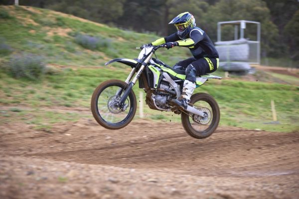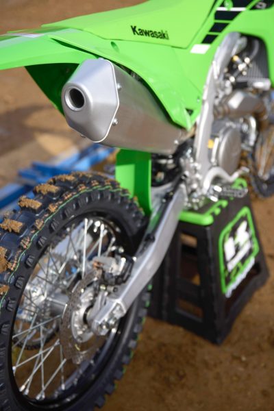 The suspension is a little soft. The front Showa inverted telescopic coil-spring fork, with 21-way compression and 22-way rebound adjustability, and the rear Uni-Trak gas-charged shock, though technically impressive, feel far too soft for a 450. With a front wheel travel of 305mm and a rear travel of 307mm, the setup feels like it’s designed for a smaller 250 rather than a powerful 450. The suspension sits low in the stroke, making the bike feel a little under-sprung and less stable at high speeds at our testers at our 450cc motocross shootout. For riders in the 70kg range, this might be adequate, but for anyone heavier or more aggressive on the track, it fails to showcase the bike’s true potential.