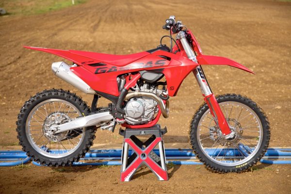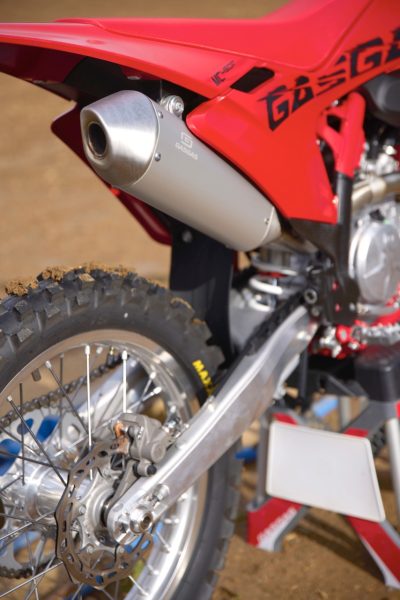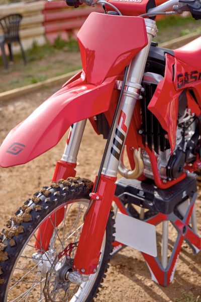 In terms of handling, the GASGAS shares the same chassis height as the KTM, with a seat height of 956mm and a generous ground clearance of 343mm, making it well-suited for riders of varying sizes. The softer suspension setup, achieved with a WP XACT-USD air fork with 300mm of travel in the front and a WP XACT Monoshock in the rear, emphasises comfort. The suspension is more forgiving over smaller bumps and uneven terrain, an ideal feature for intermediate riders or those focused on a smoother ride rather than hard, aggressive performance. That said, like the KTM and Husky, the GASGAS fork remained sensitive and reacted to nearly every bump on the track at our 450cc motocross shootout. This hyperactivity may prompt faster riders to consider adjustments, as the fork can feel bouncy, potentially distracting on more challenging sections.