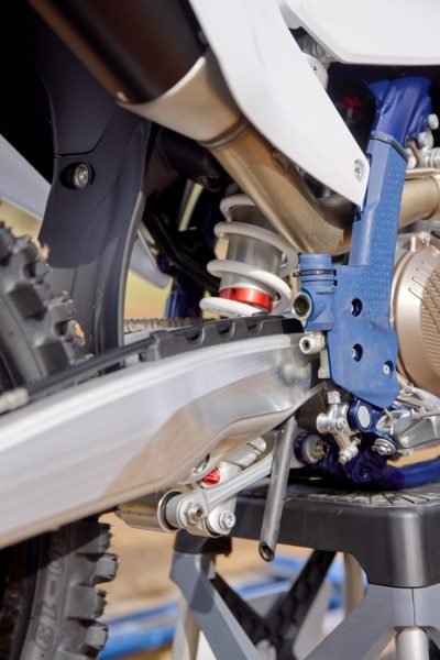 The WP XACT-USD air fork, with 305mm of travel, is a point of contention. Much like on the KTM and GASGAS, this fork felt hyper-responsive, reacting to every small bump on the track at our 450cc motocross shootout. If WP’s goal was to maximise feedback, it has succeeded. However, the result is that I find myself dialling in the rebound as far as possible to calm the fork down and prevent it from bouncing. In high-speed sections, the front end can feel overly active, leaving me focused more on managing the fork than pushing the bike’s limits.