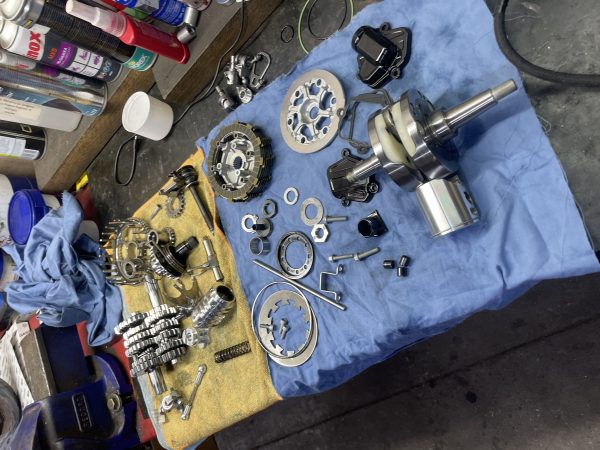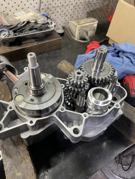 The engine starts with a fully polished gearbox, clutch basket, crank and all kickstart and water pump gears. The idea of this is to reduce friction in the gearbox. This in turn helps the gearbox run cooler and cleaner while also adding strength and durability to the gearbox, as it removes any burs or impurities that the gears may fracture or break from.