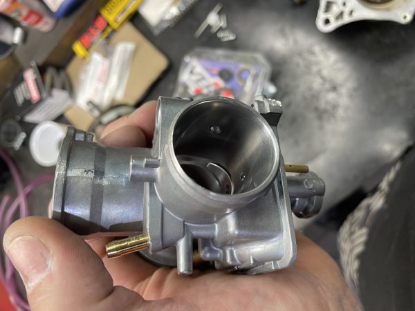 The carburettor is bored to 29mm and the shape of the carb is altered. The jetting is also changed to suit the 112cc capacity. A common misconception is that a bigger capacity engine needs bigger jets but this is not always the case. The 112cc has a smaller main jet and pilot jet compared to the 85cc but the engine has more vacuum and is able to draw more fuel from smaller jet sizes.