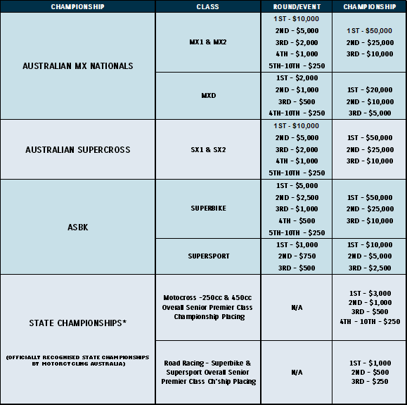Only the nominated Motorcycling Australia sanctioned events will be eligible for contingency. Suzuki Support Riders registered for claiming contingency must use the Claim Form attached. Results will be verified by Suzuki against official M.A. results.