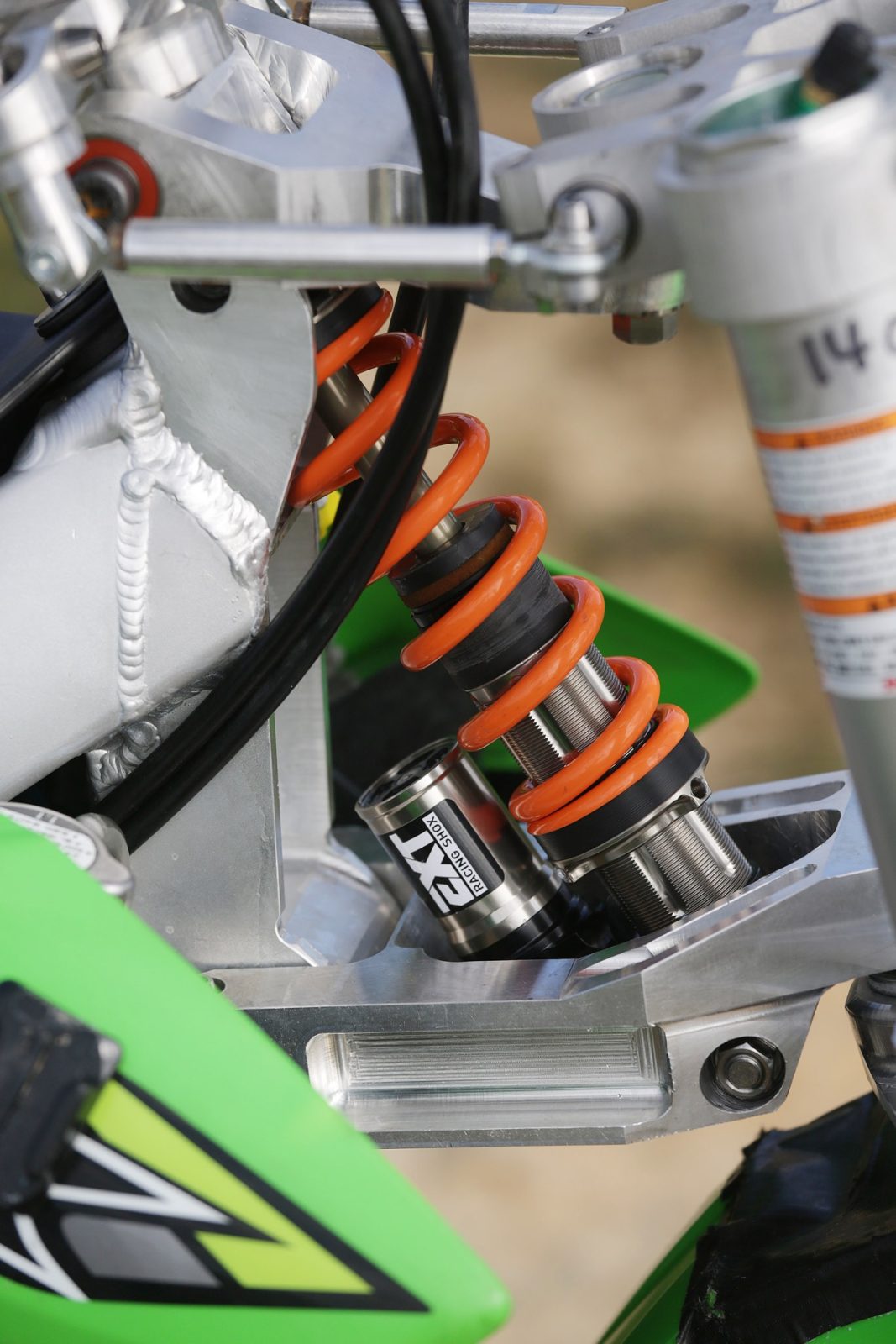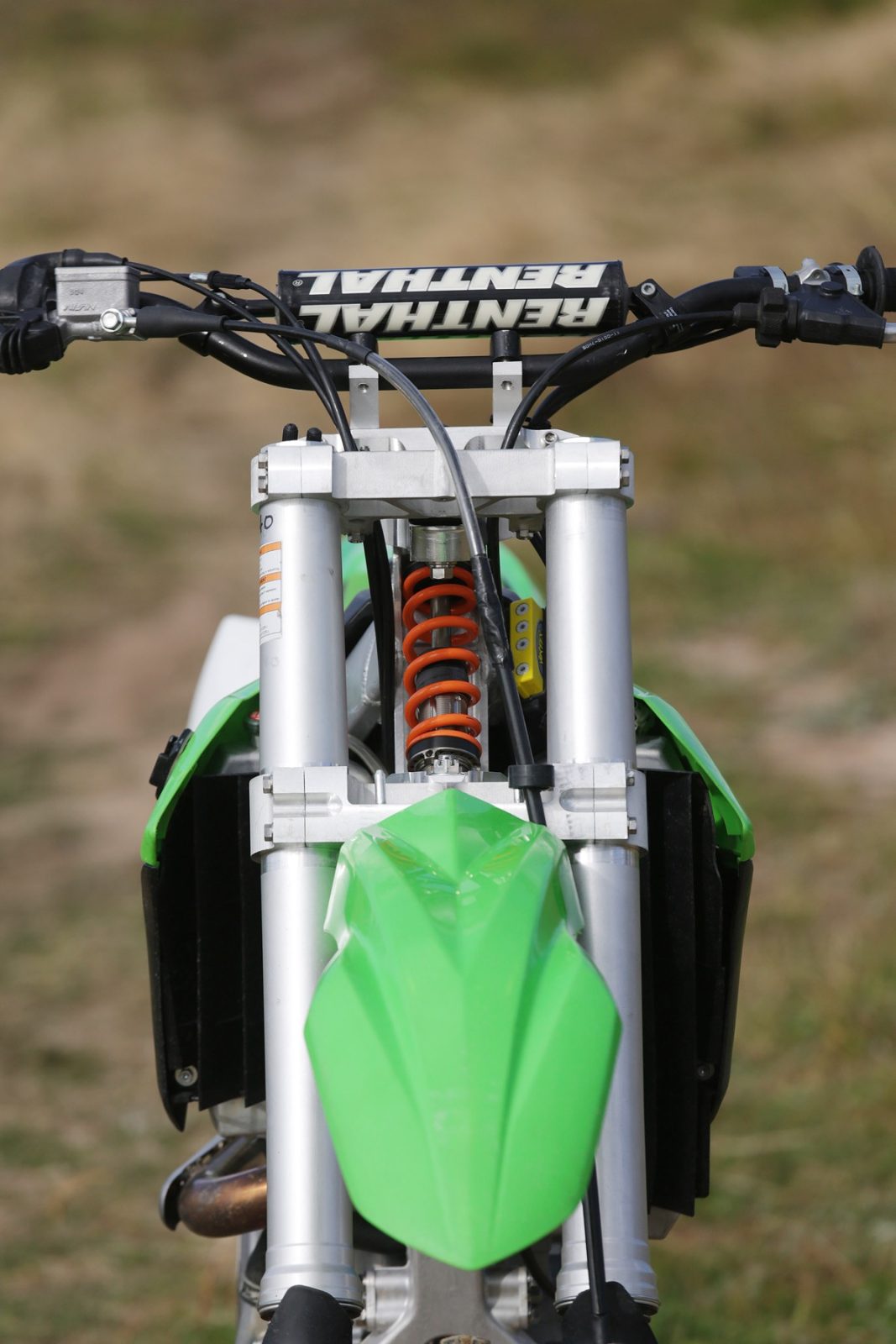 Yes it does inevitably add weight but, with careful design, it doesn’t have to be a lot. The standard 2018 Kawasaki KX450F [with Showa SFF-Air fork) has a wet weight of 108.5kg. The TwoEvo KX450F has a wet weight of 111.5kg, so the TwoEvo suspension adds about 3kg, which isn’t a deal breaker. Although that weight is high and forward it shouldn’t be too much of an issue for a trail/enduro bike.