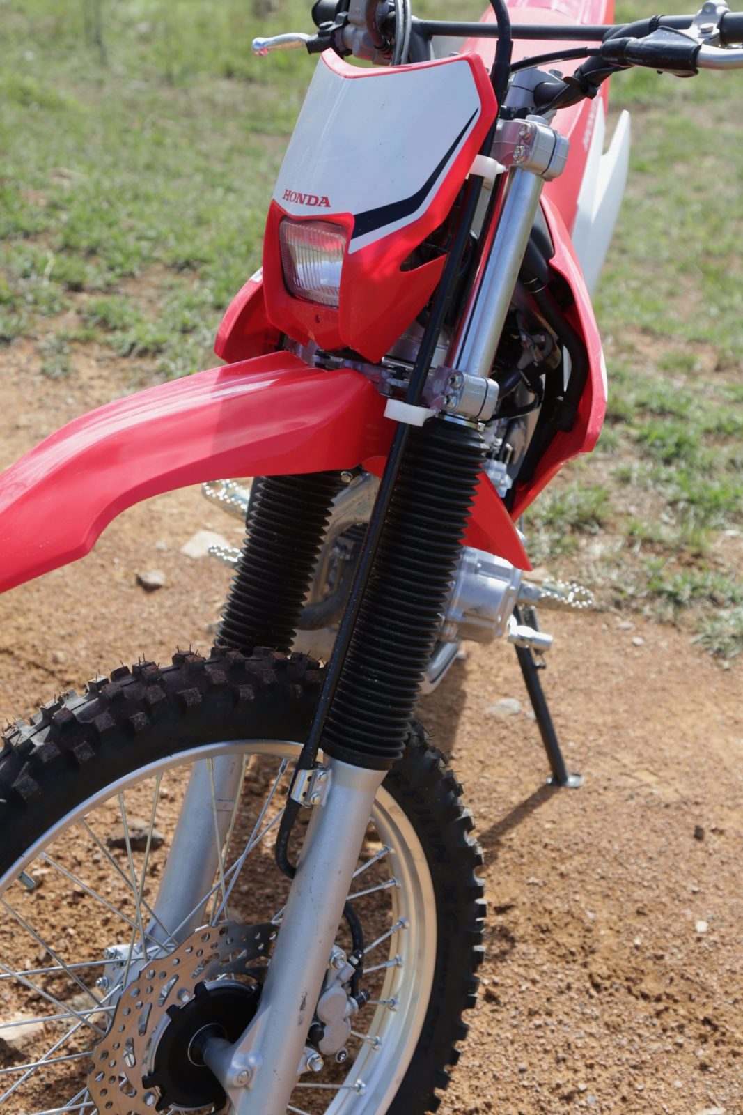 A new tubular steel frame works with a 41mm conventional fork (up from 37mm on the 230F) and Honda’s proven Pro-Link monoshock has been completely revised and has 230mm of travel with preload spring adjustment (I had one in my first XR back in the early ’90s) to deliver a great trailbike feel. Honda has gone with quality running gear as well, including a set of hydraulic brakes front and rear (the 230F only has a disc on the front), a five-speed gearbox (as opposed to the 230Fs six-speeder) and electric start. The bike has also been given similar styling to the CRF motocross range and a handy low fuel light (no petrol tap) and “key on” indicator light.