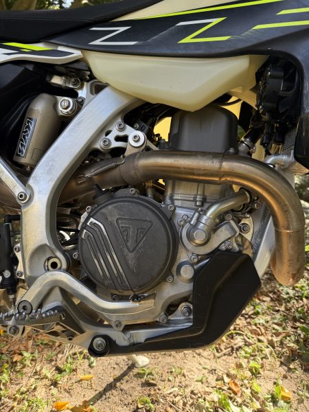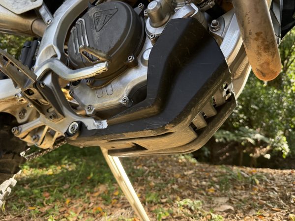 Trail riders will be happy to know both bikes come with motocrss-style handguards and a skid plate straight from the factory. It sounds minor, but plenty of brands still leave those out. We smashed through vines, bounced off rocks and didn’t bend a single lever. The handguards are scuffed to hell now, but they did their job. The skid plate is a neat plastic design – quiet, light, and effective without trapping mud like big alloy ones do.