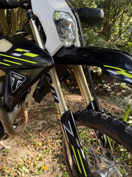 The 250-E surprised us even more. It feels like a 350 in the way it makes torque – meaty through the mid-range and endlessly tractable. Triumph’s longer gearing helps too; it doesn’t rev out quickly like some 250Fs. Instead, it keeps building and pulling, giving it a broader spread of usable power.