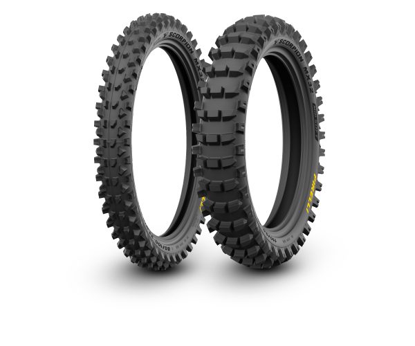The new Pirelli Scorpion MX32 MidSoft rear tyre has new lateral-shaped knobs that not only improve torsional stiffness but also work like a scoop to bite into the dirt. The knobs are shaped and designed to prevent tearing, and the side knobs are designed to reduce rotational mass. The structure of the tyre is stiffer, as is the sidewall, but the vertical cap of the tyre has been made softer to help with bump absorption. The older model MX32 MidSoft was a very good tyre with great drive and straight-line traction, but it wasn’t long lasting. The soft structure meant the tyre would get torn up and worn very quickly, so Pirelli has set about keeping all the performance of the old MX32 MidSoft but making it more durable.