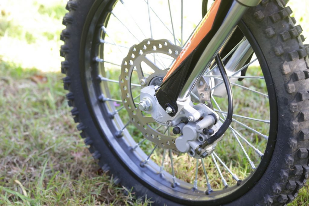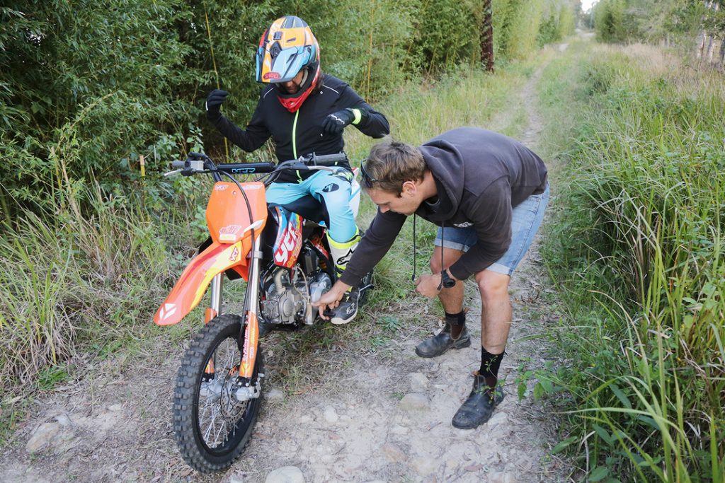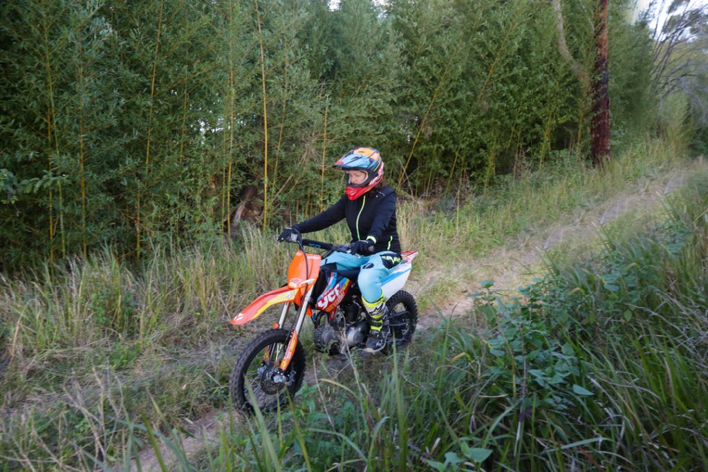 The gears are close together, which is great for learners trying to work out which gear to be in, but the clutch isn’t as light as we’re now used to on most Japanese kids bikes. The motor is a linear chugger. It’s slow compared to a Honda CRF150R, even the 150F, but that’s okay because the YCF isn’t designed to be ridden like a race bike. If they were, they certainly wouldn’t have that gearbox. The throttle pull is short, almost like it has a stop installed, so there’s no chance of a graceful whisky-throttle trip off the back.
